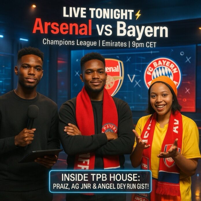 We dey live from TPB studio, and the atmosphere don already hot as Arsenal dey ready to host Bayern Munich for one of the biggest Champions League clash wey fit happen this season.