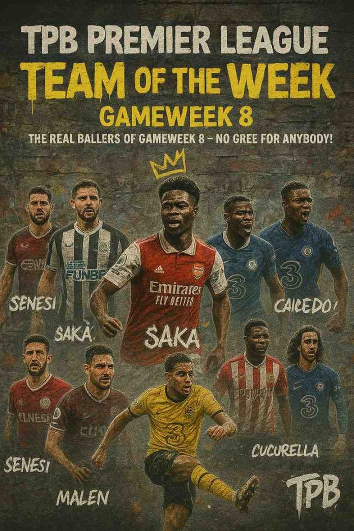 This week’s lineup get everything – class, energy, and goals. Bruno Guimares and Caicedo lead the midfield. Saka and Semenyo dey terrorize wings, and Malen finish things sharp for front. Big shoutout to Bruno Guimaraes for running midfield like him house.